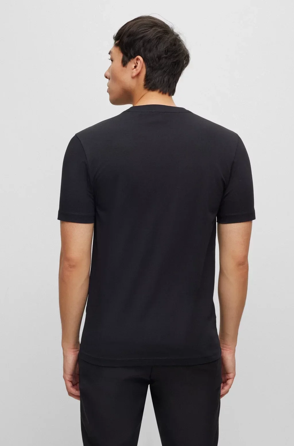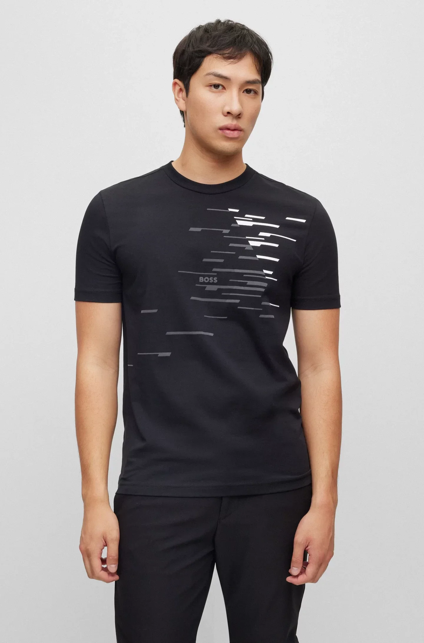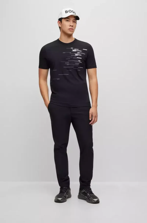 Un t-shirt distinctif coupe droite signé BOSS Homme, confectionné en jersey de coton stretch et orné d’un motif artistique et du logo de la nouvelle saison.