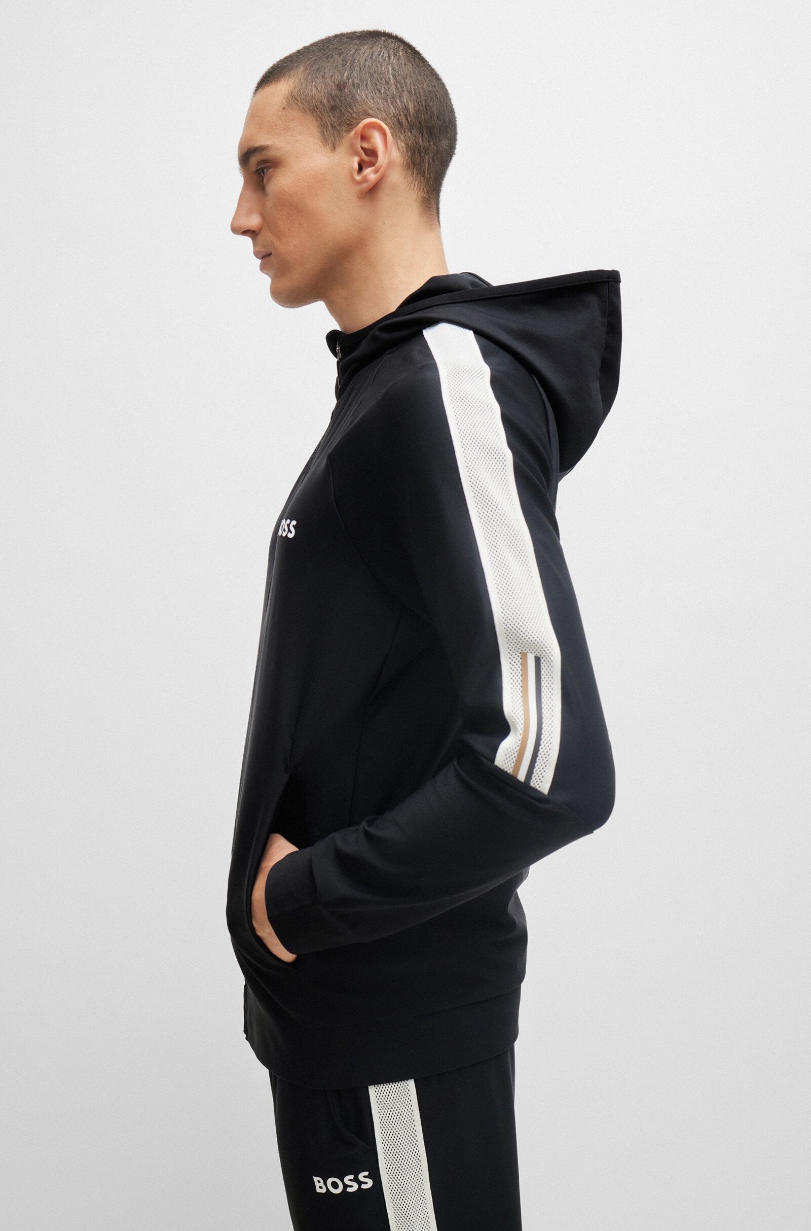 Un sweat à capuche zippé distinctif à la coupe droite signé BOSS Homme, confectionné en matière interlock et orné d’un motif artistique et d’un logo à rayures emblématiques.