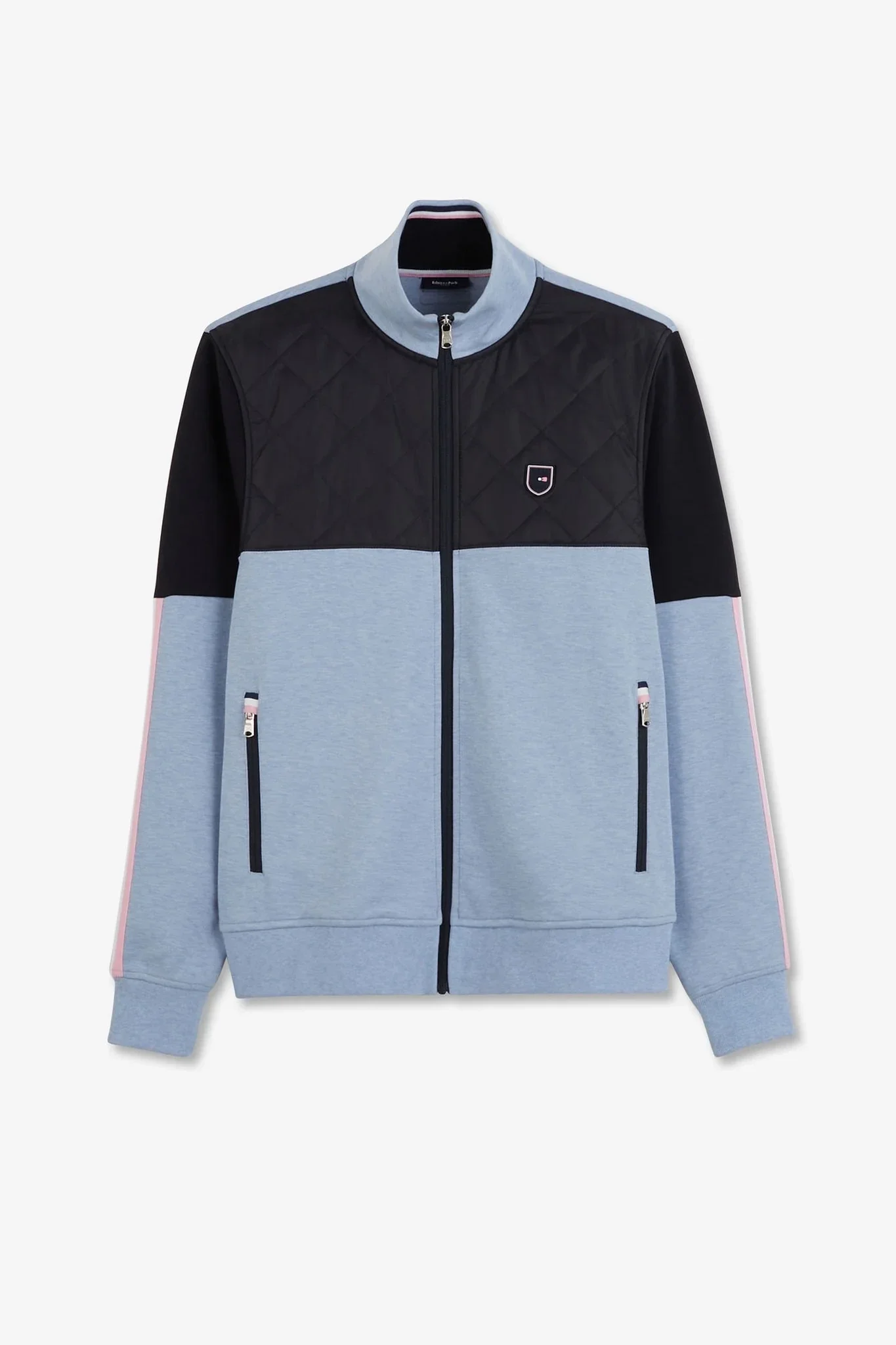Ce sweat garantit confort et résistance grâce à sa confection en coton épais avec des empiècements déperlants et matelassés sur le devant. Il est doté d'un col montant bien couvrant, d'une fermeture et de poches zippées et affiche un badge logo écusson sur la poitrine. On note les bandes tricolores à l'intérieur du col et au niveau des manches