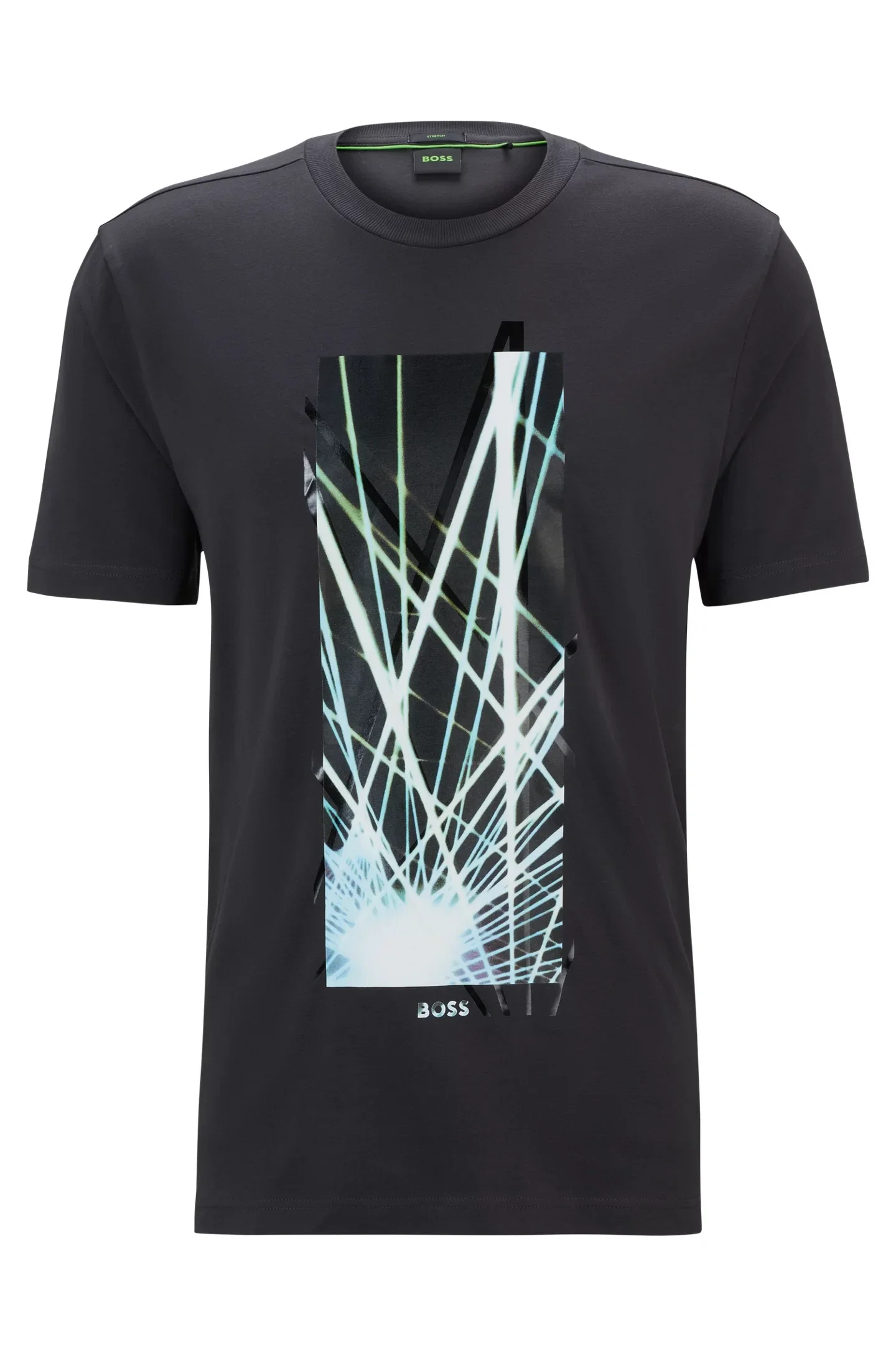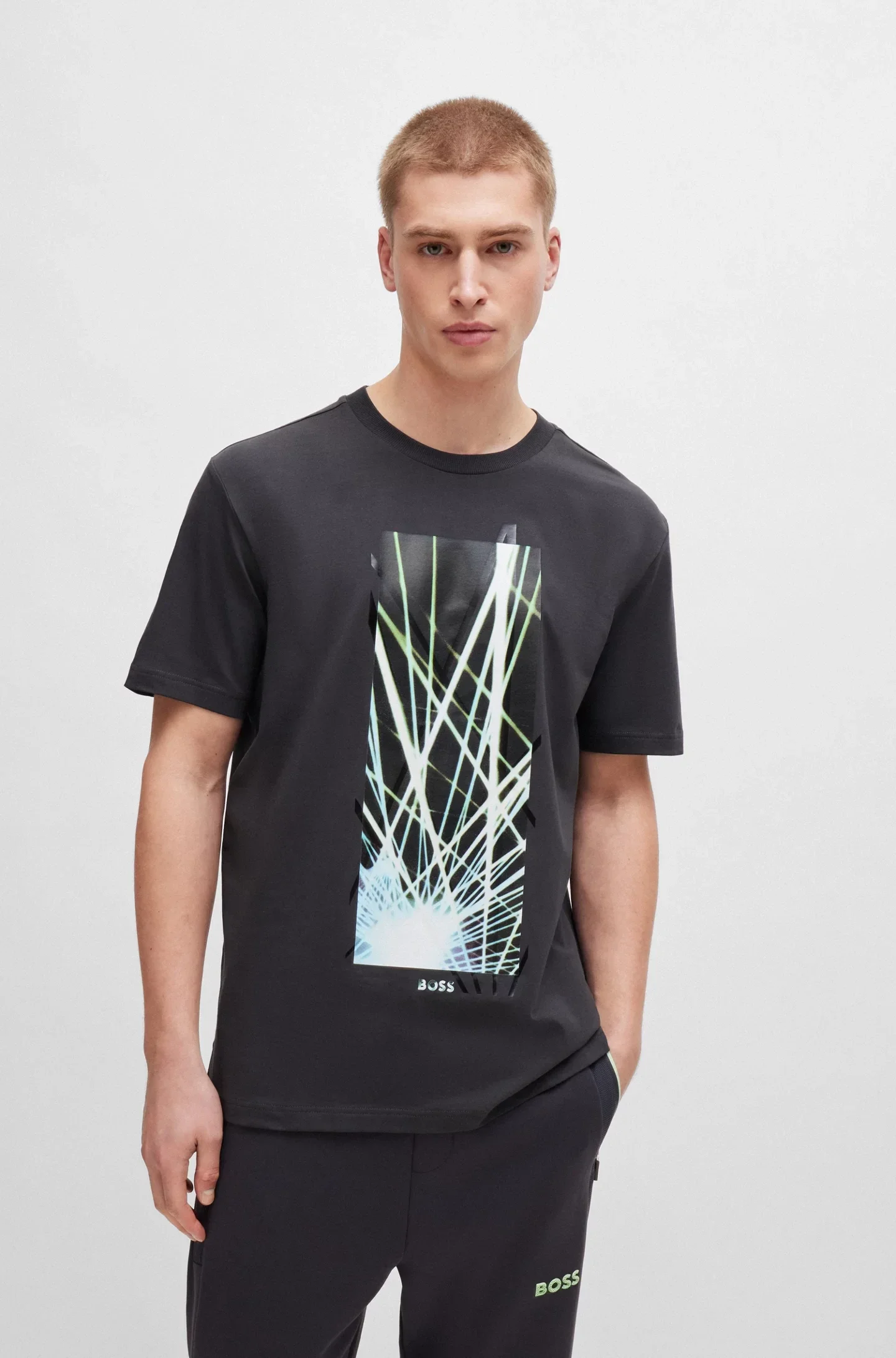 Un t-shirt BOSS Homme à la coupe Regular Fit, confectionné en jersey de coton stretch et orné d’un motif artistique tendance et d’un logo sur la poitrine.