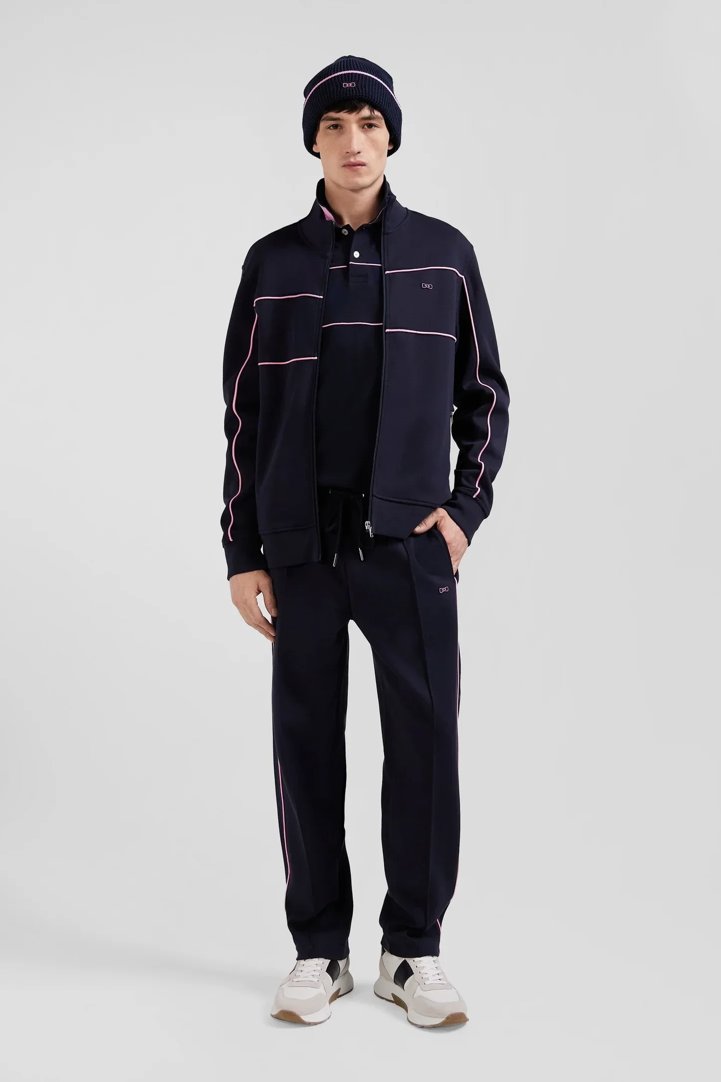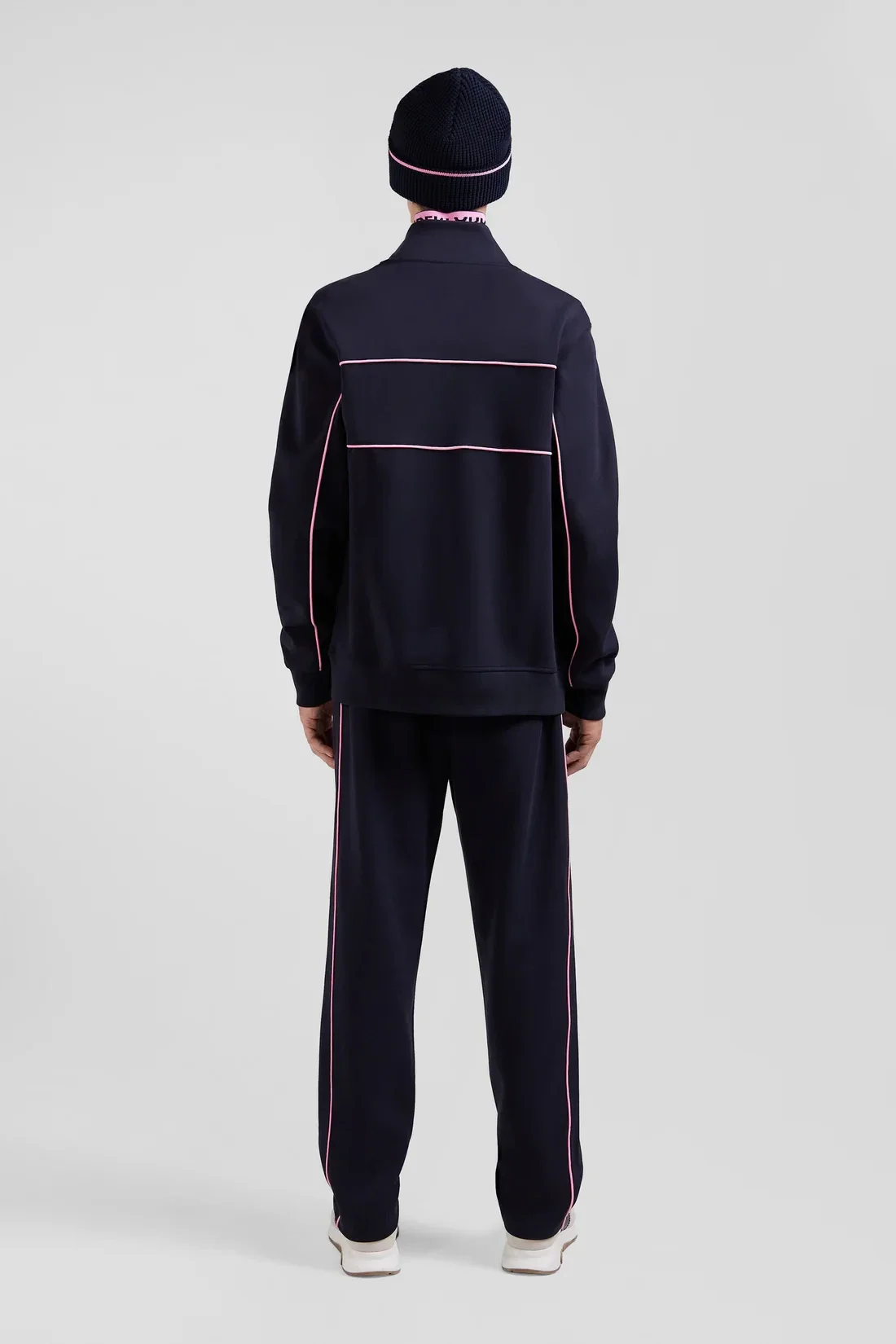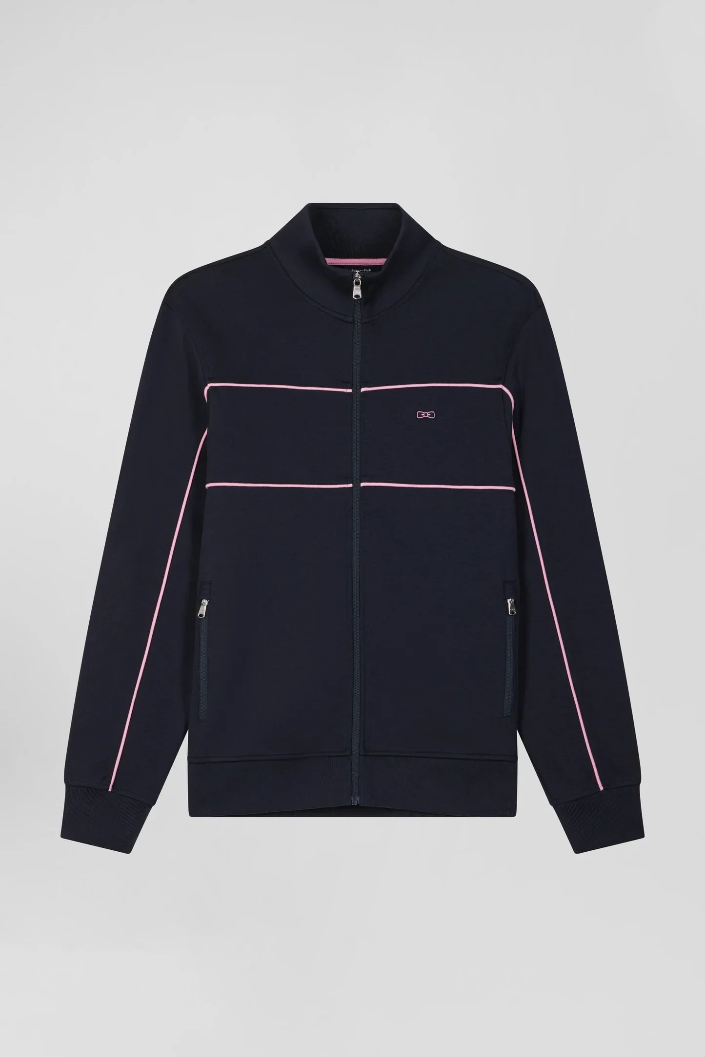 Ce sweatshirt bleu marine à zip droit et col montant zippé confectionné en coton mélangé se porte aussi bien en sweatshirt qu'en blouson de mi-saison. Ses détails de passepoils roses, rappels de la couleur iconique Eden Park, contrastent élégamment avec le bleu marine tout en structurant ce sweatshirt à la construction soignée.