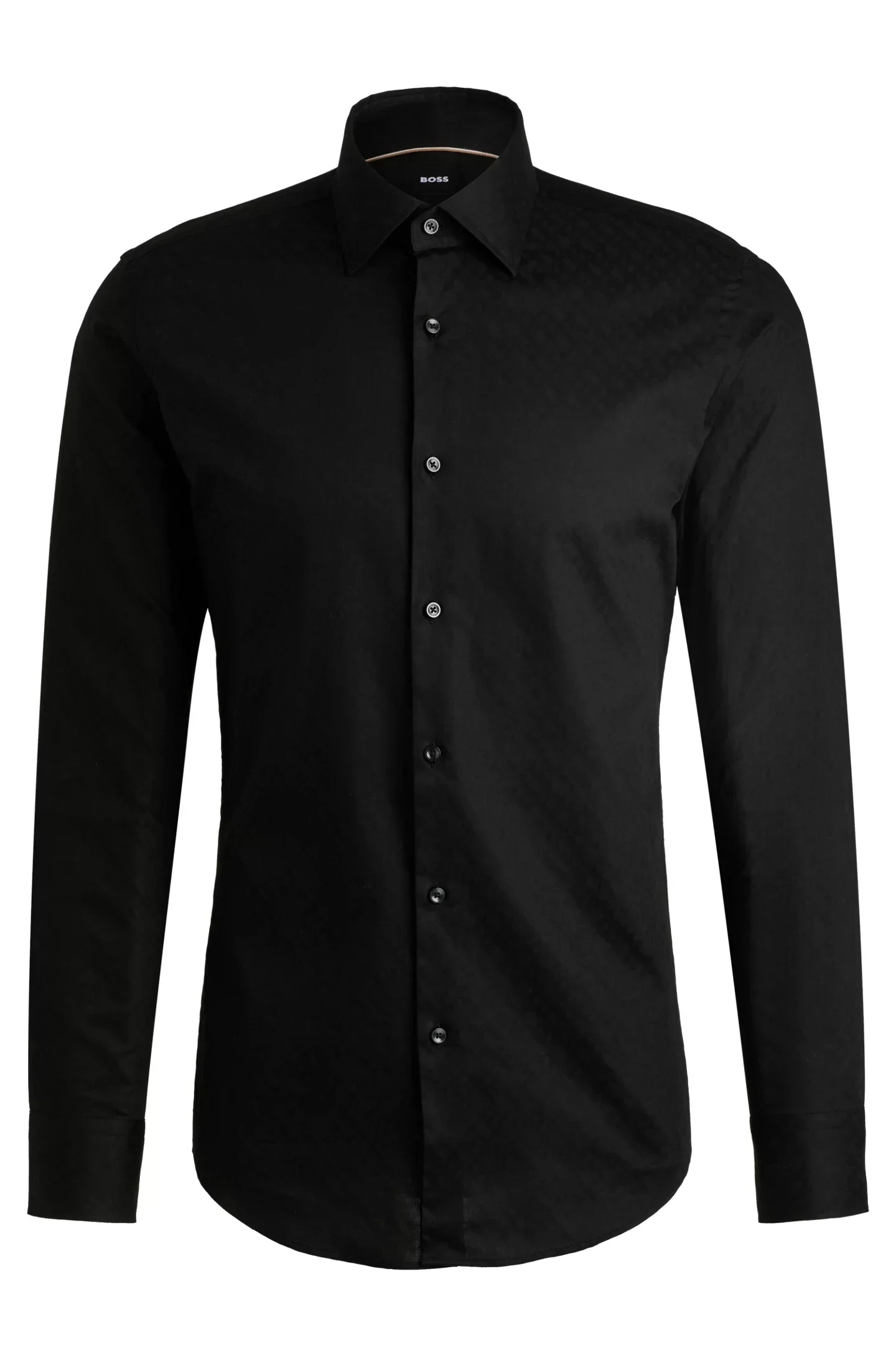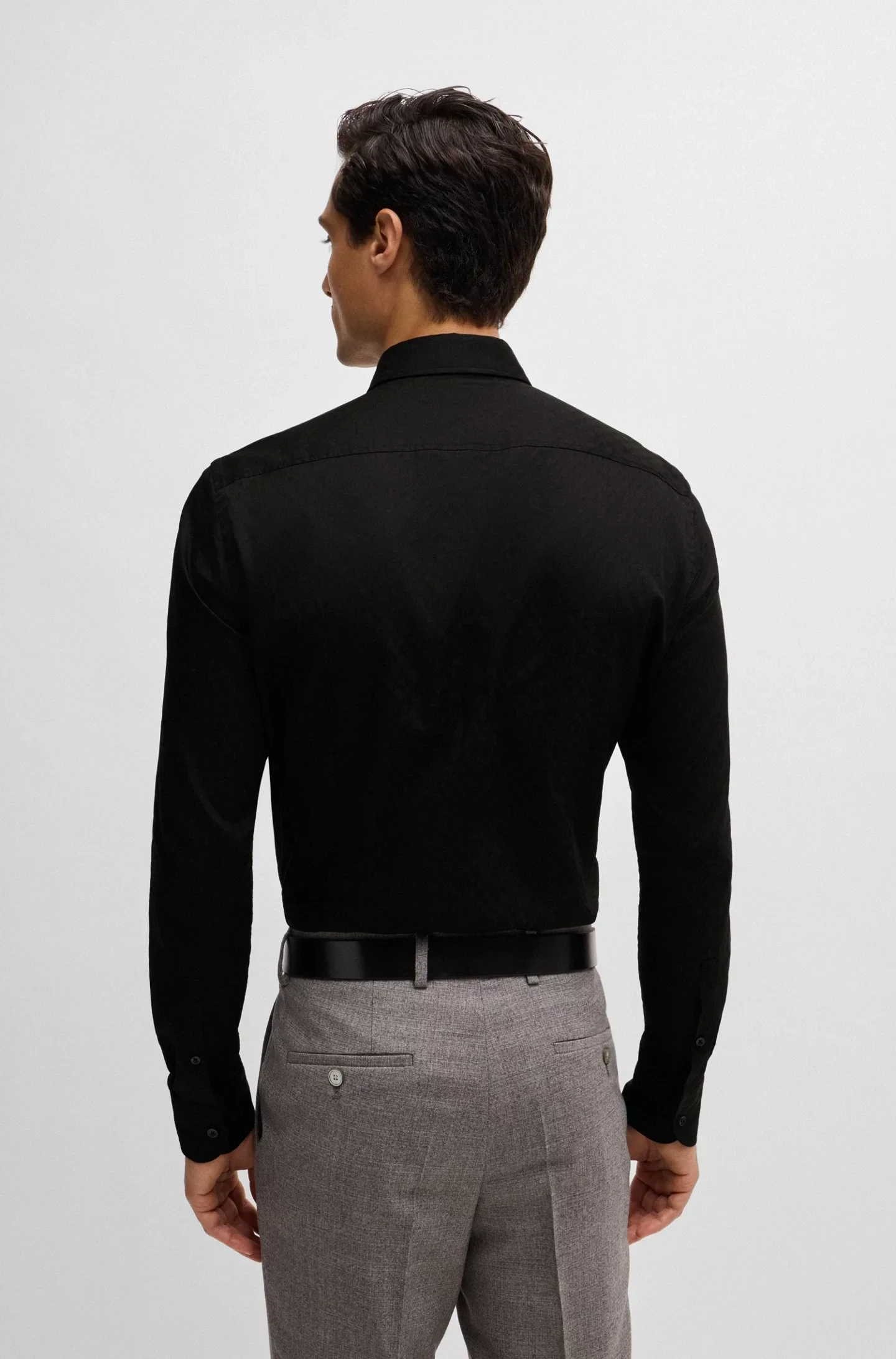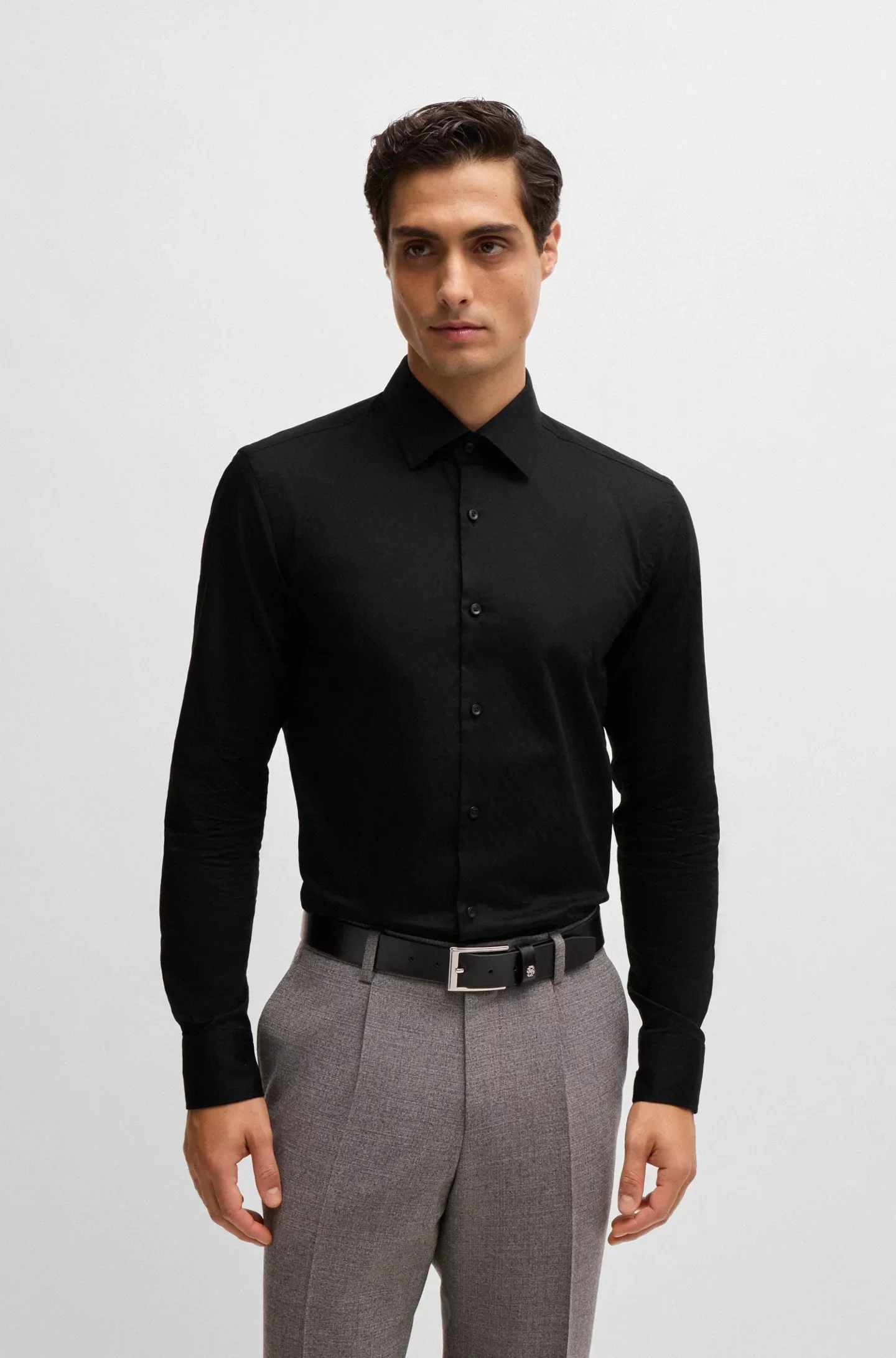 Une chemise d’affaires au style élégant signée BOSS Menswear. Subtilement tissée de monogrammes en jacquard, cette chemise est confectionnée en coton italien légèrement brillant et dotée d’une coupe définie pour une silhouette contemporaine. Le col Kent est orné d’une bande signature à l’intérieur.