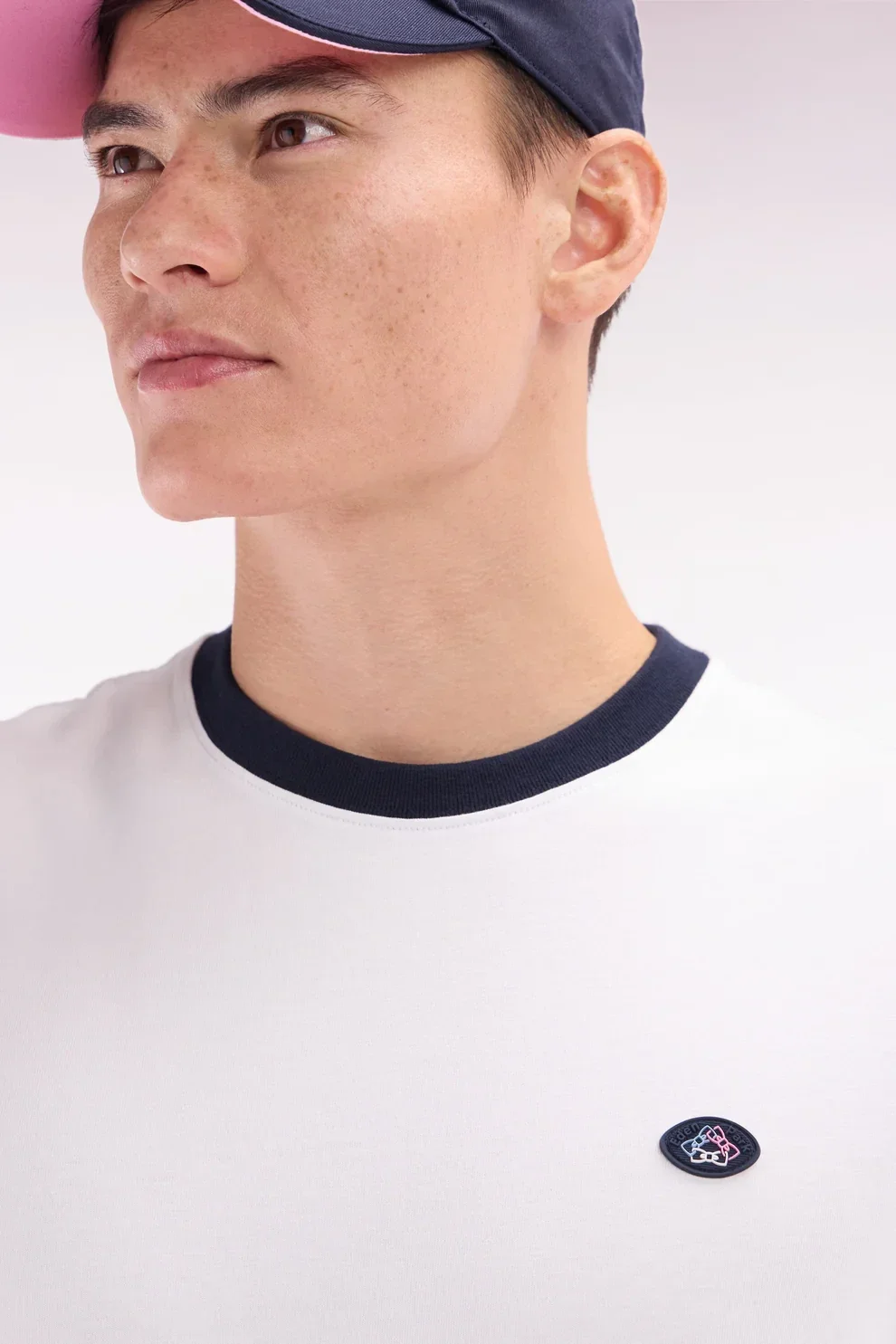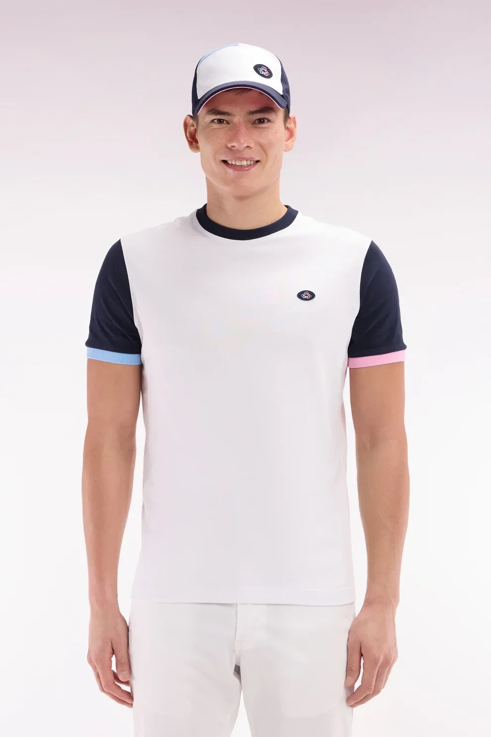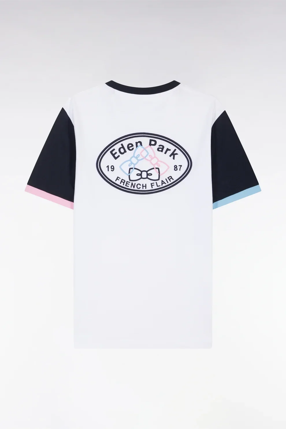 Ce T-shirt colorblock, proposé en marine ou blanc, joue sur des manches contrastées et des bords côtes structurés pour affirmer sa personnalité. Notre badge ballon de rugby en gomme silicone orne la poitrine, tandis qu'une broderie mêlant 3 nœuds papillons tricolores anime élégamment le dos, agencés en un clin d'œil à une mêlée de rugby.