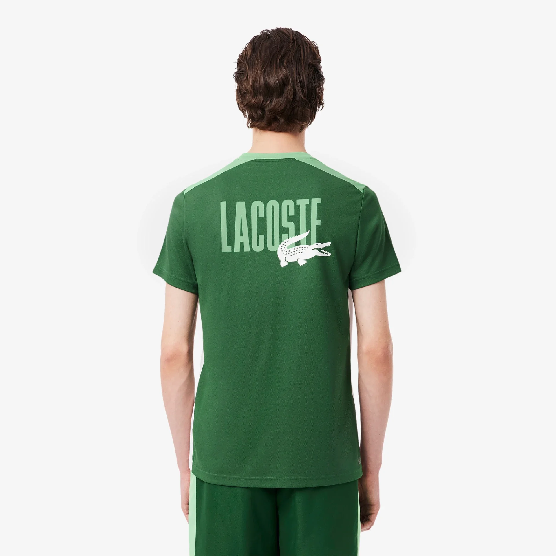 Ce t-shirt à la croisée de la mode et du sport est un concentré de codes Lacoste. Conçu dans l’iconique Piqué, il libère le mouvement et maintient au sec grâce aux propriétés de la technologie Ultra Dry. À sa technicité s’ajoutent un color-block emblématique et un imprimé signature, pour inviter le style sur tous les terrains.