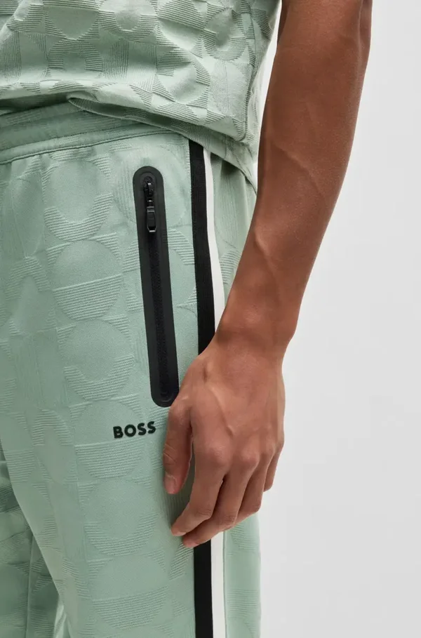 Doté de poches zippées et de rayures sportives latérales, ce bas de survêtement BOSS Homme séduit par son motif ton sur ton discret. Coupe décontractée. Cordon de serrage ajustable à la taille.