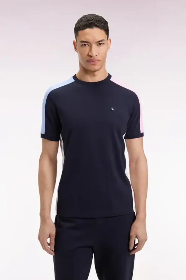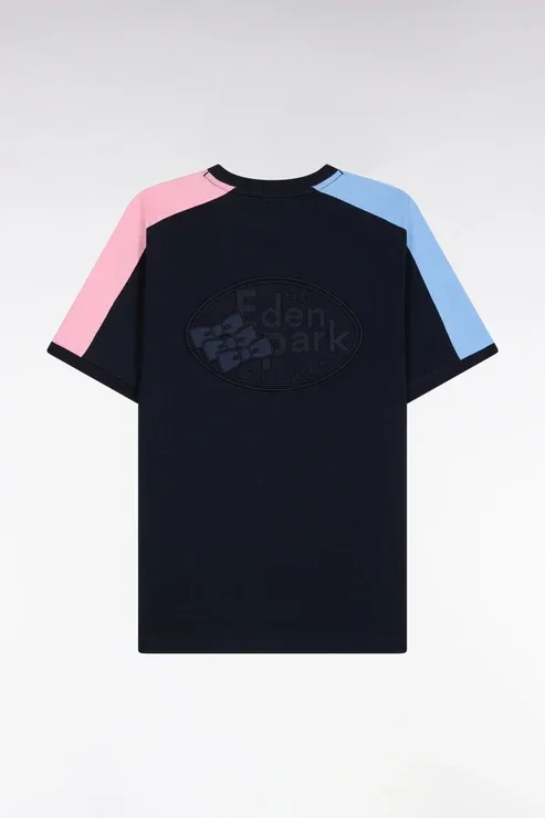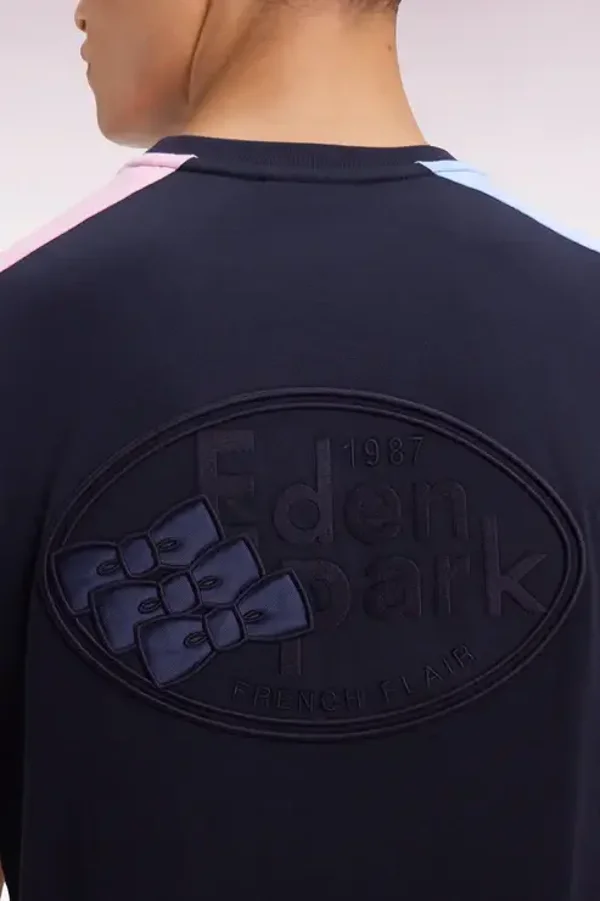 Ce T-shirt complète la ligne de vêtements masculins se distinguant par des découpes soignées dans les coloris iconiques de la maison associés au bleu marine. Une broderie dos au nom d'Eden Park soulignée d'un insert de tissu cravate cerclé parfait ce T-shirt en jersey de coton. Bordures de manches et encolure en bords-côtes tricotés garantissent confort et tenue à ce modèle unique