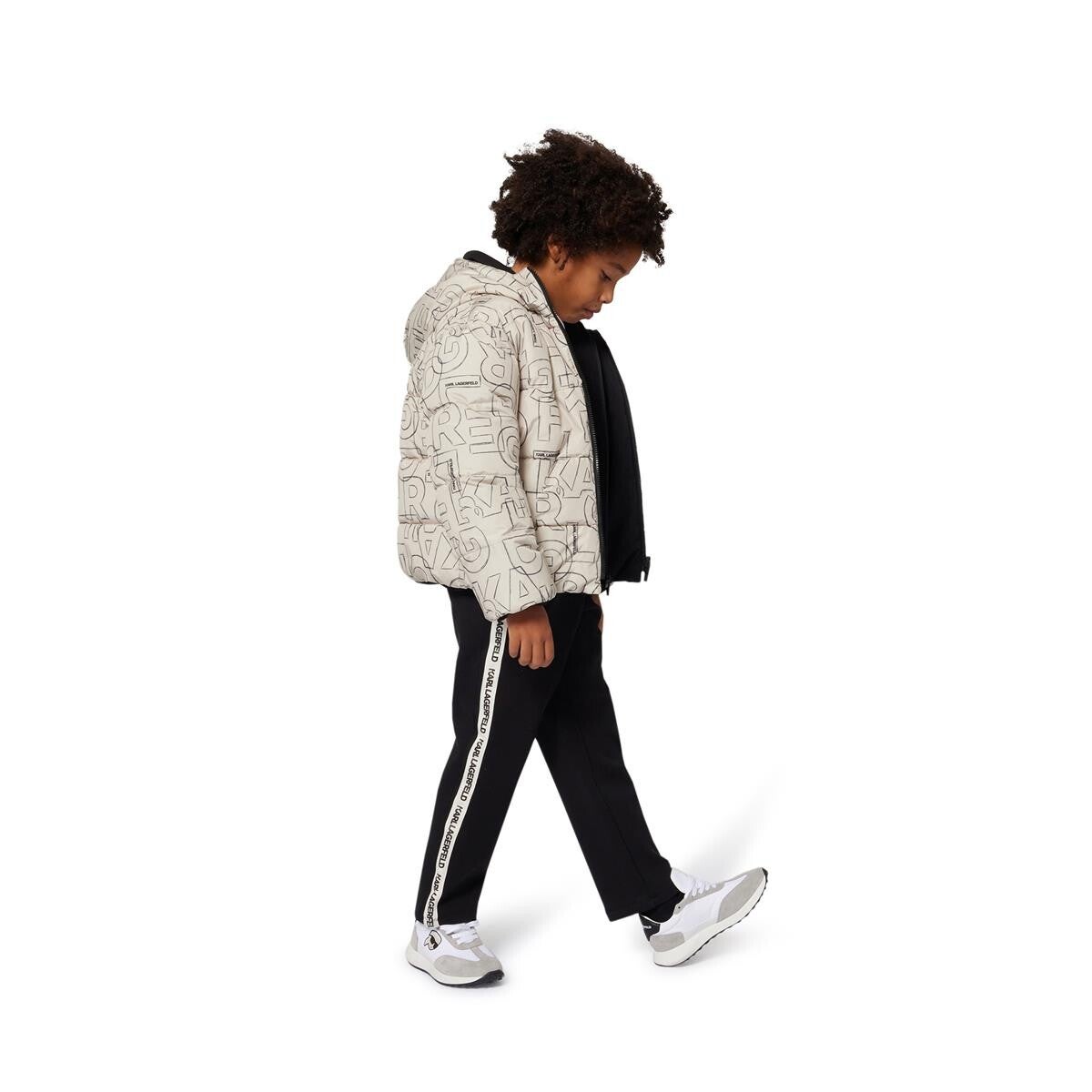 - Doudoune réversible à capuche. Un côté en polyester imprimé siglé KARL LAGERFELD avec poches sur le devant. Illustrations siglées sur la poitrine. Autre côté uni, en polyester et poches sur le devant. Illustration siglée au dos. Rembourrage ouate. Fermeture zippée sur le devant. Poignets élastiqués.