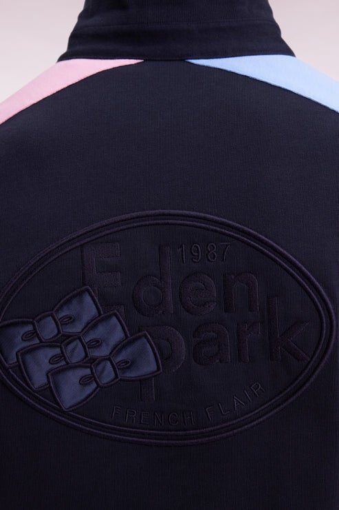 Ce maillot à manches longues en jersey épais se distingue par ses découpes contrastées aux manches et sa broderie dans le dos, rehaussée d'incrustations de tissu cravate ton sur ton pour une allure sportive maitrisée. Le col en twill présente un dessous en maille plate, tandis que les poignets en bord-côtes assurent un ajustement confortable. Une pièce sport-chic essentielle alliant style et détails rugby soignés comme sa plaquette de boutonnage contrastée et ses boutons inspirés de l'ovalie