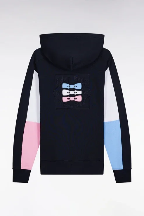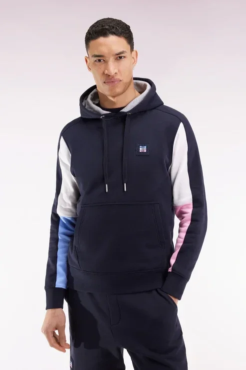 Ce sweatshirt tricolore à capuche en molleton gratté conjugue confort et esprit graphique. Son molleton légèrement épais offre une chaleur douce idéale pour le quotidien, tandis que les découpes contrastées aux manches et la capuche doublée en coloris gris ou ciel dynamisent la silhouette masculine. Dans le dos, une broderie aux incrustations de jersey apporte une touche sport-chic à ce sweatshirt pensé pour suivre votre rythme de vie. Des codes discrets mais distinctifs, pour ceux qui savent lire entre les lignes d’un vestiaire travaillé, équilibre parfait entre sportivité et allure urbaine